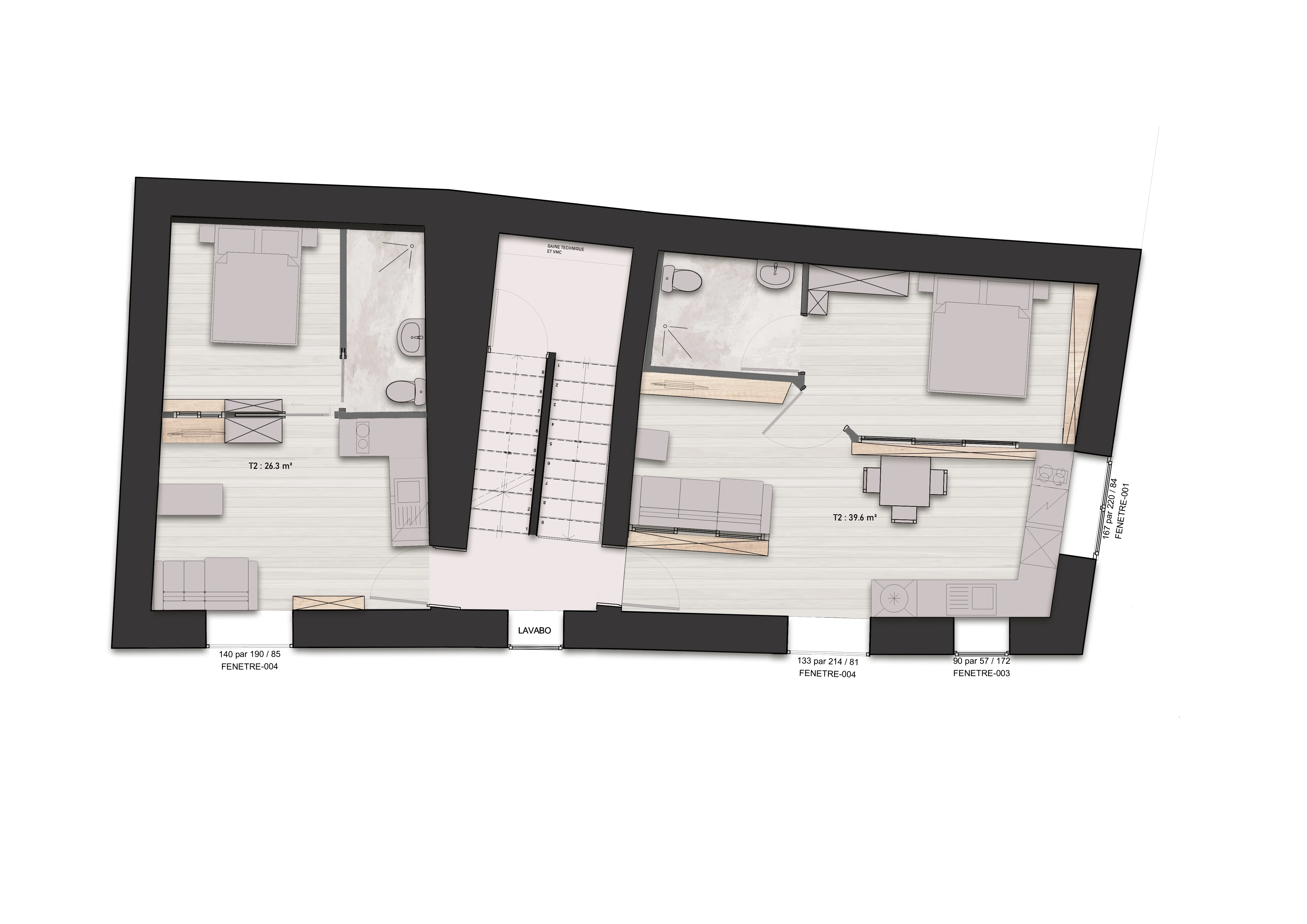 Le premier étage accueille deux logements indépendants : un T2 de 26,3 m² et un T2 plus spacieux de 39,6 m², chacun comprenant séjour, chambre et salle d’eau.