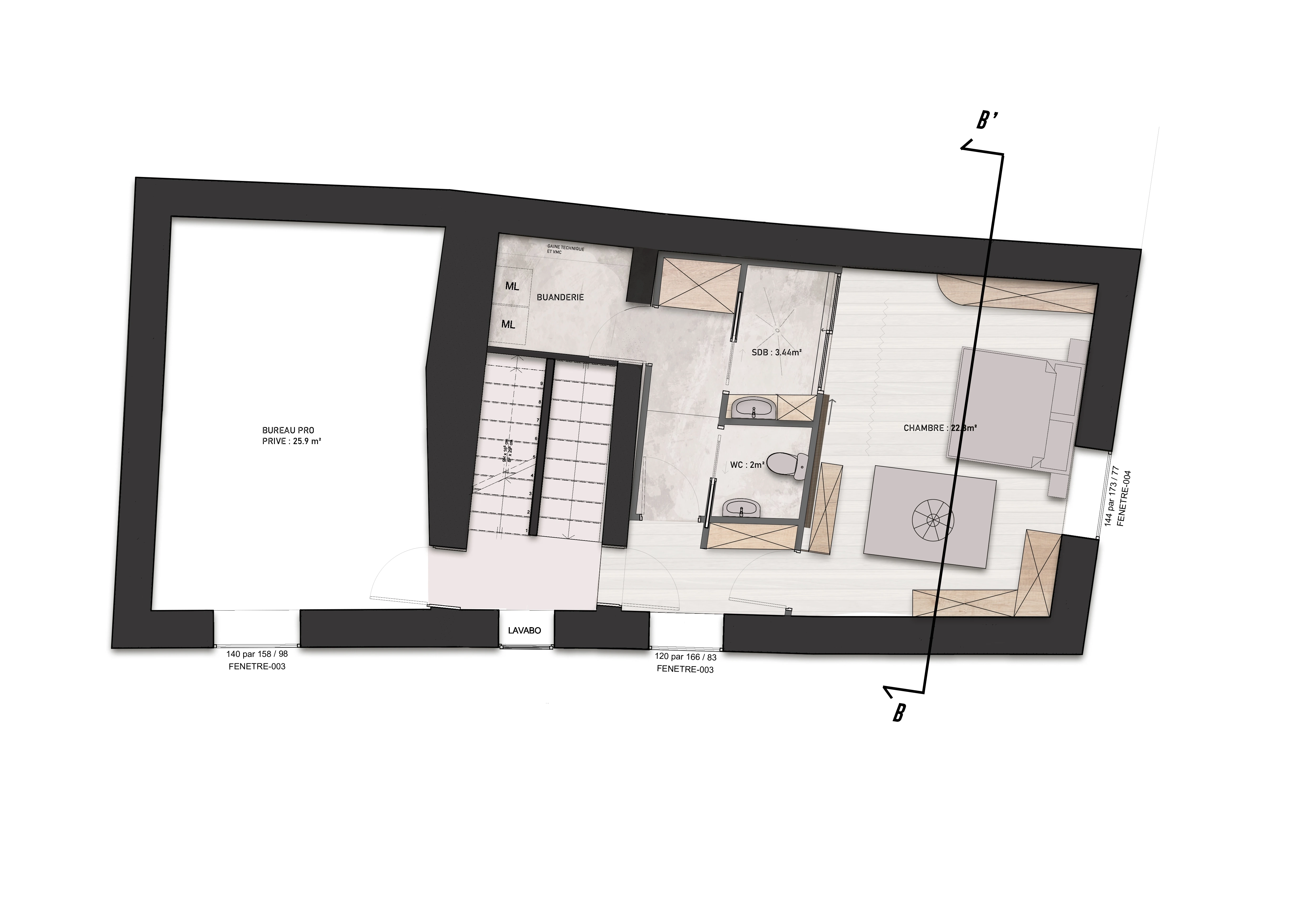 Le deuxième étage comprend un bureau professionnel privé de 25,9 m² et une grande chambre aménagée comme suite, avec toilettes discrètement intégrés et une douche visible ou occultée grâce à un système de porte coulissante en bois.