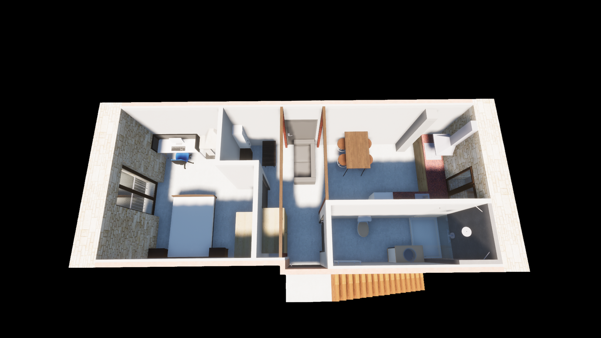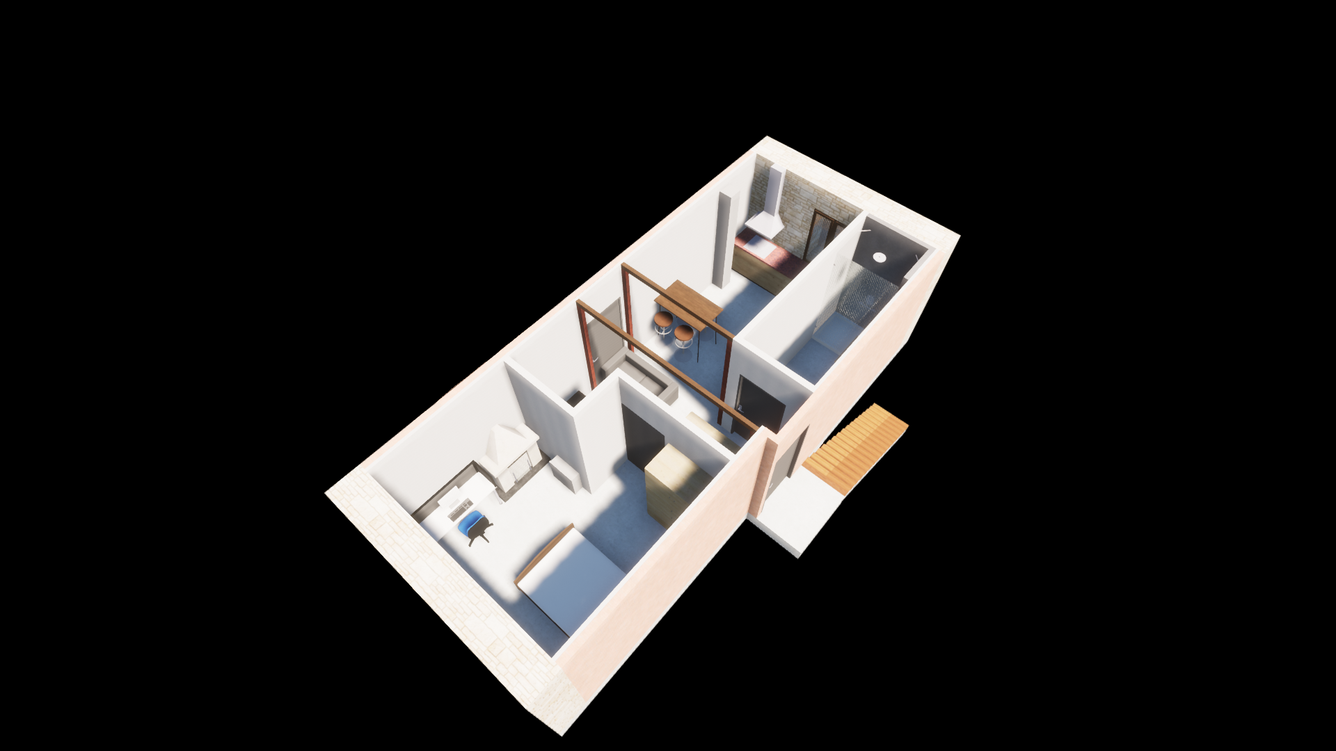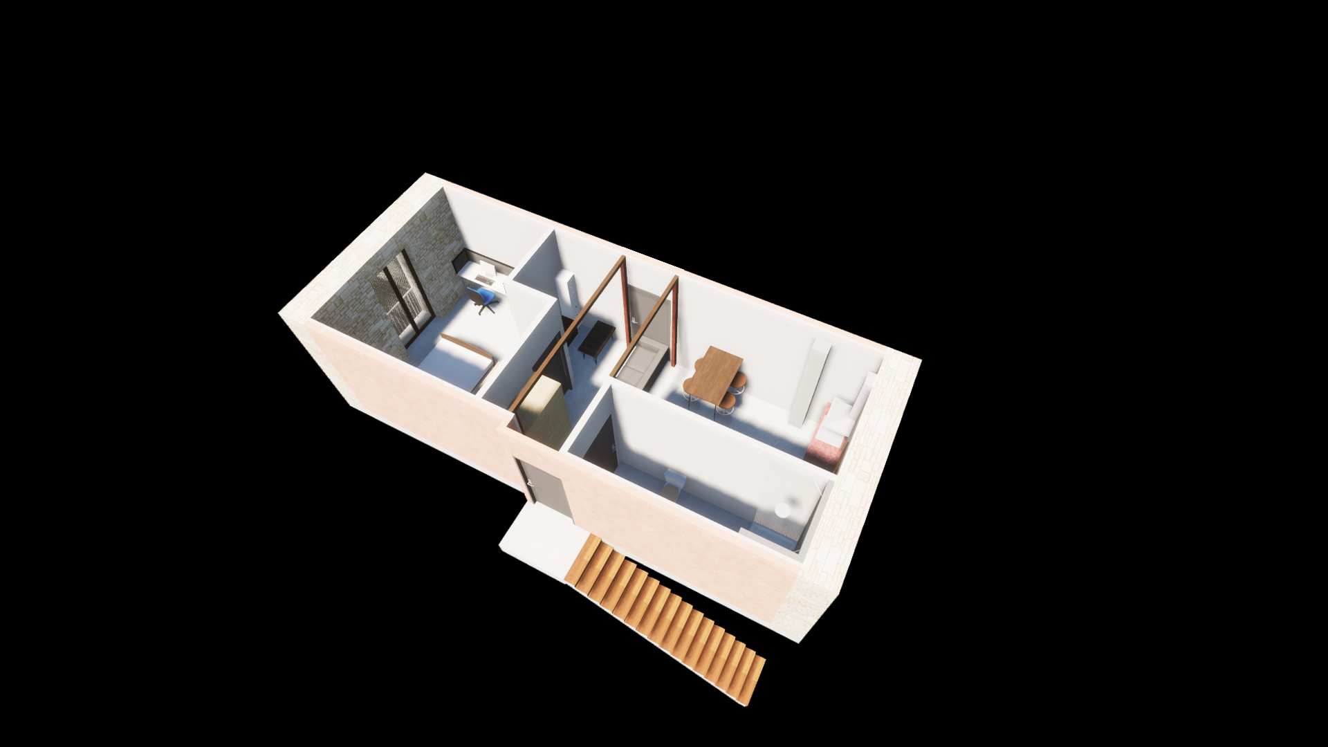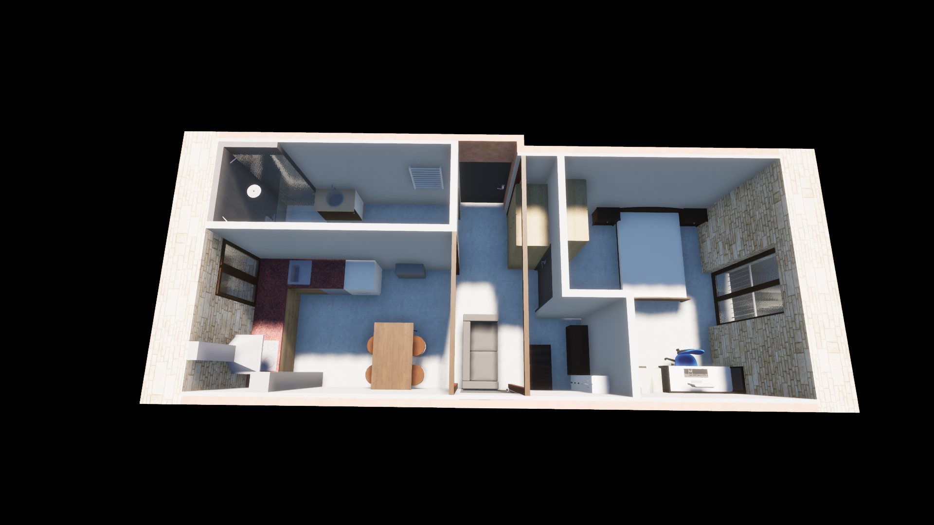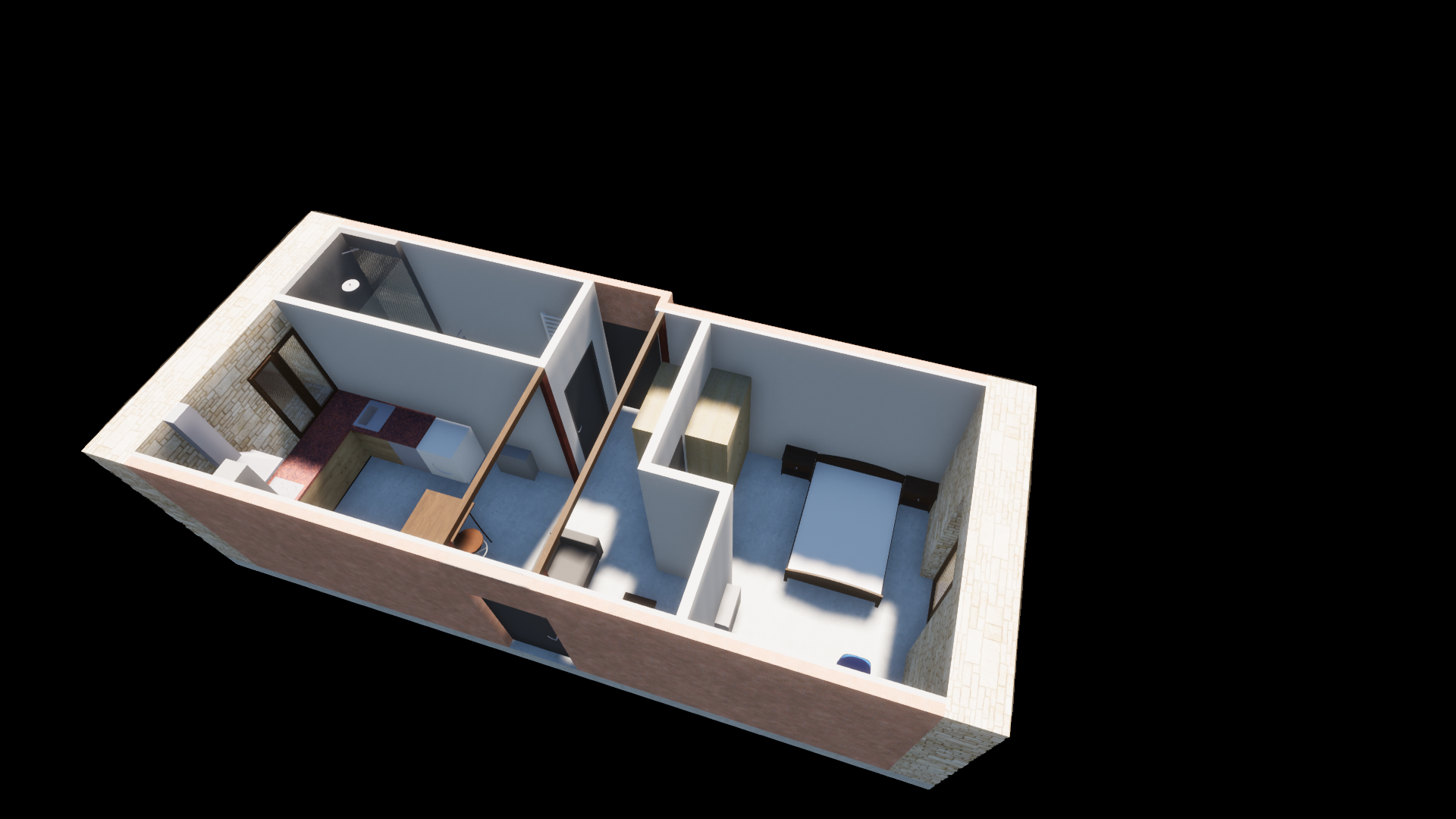 Plan d’ensemble du studio aménagé, pensé pour maximiser l’espace dans un volume restreint.